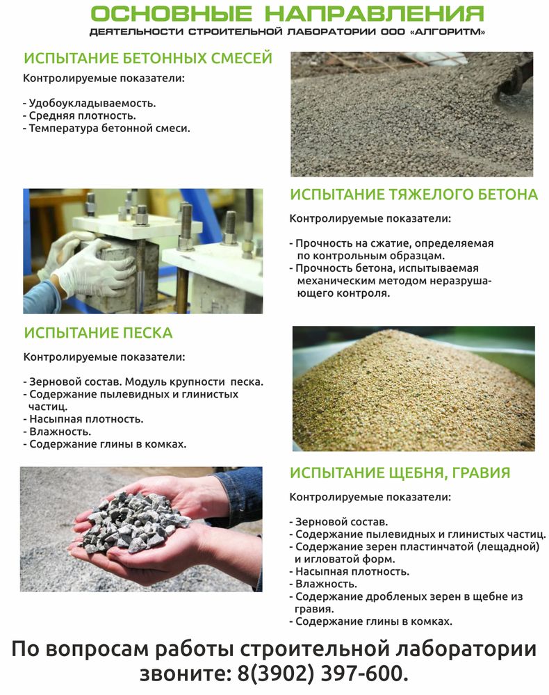 Строительная лаборатория бетонного завода «Алгоритм» осуществляет контроль качества бетона, строительных и инертных материалов, входящих в состав бетонной смеси.